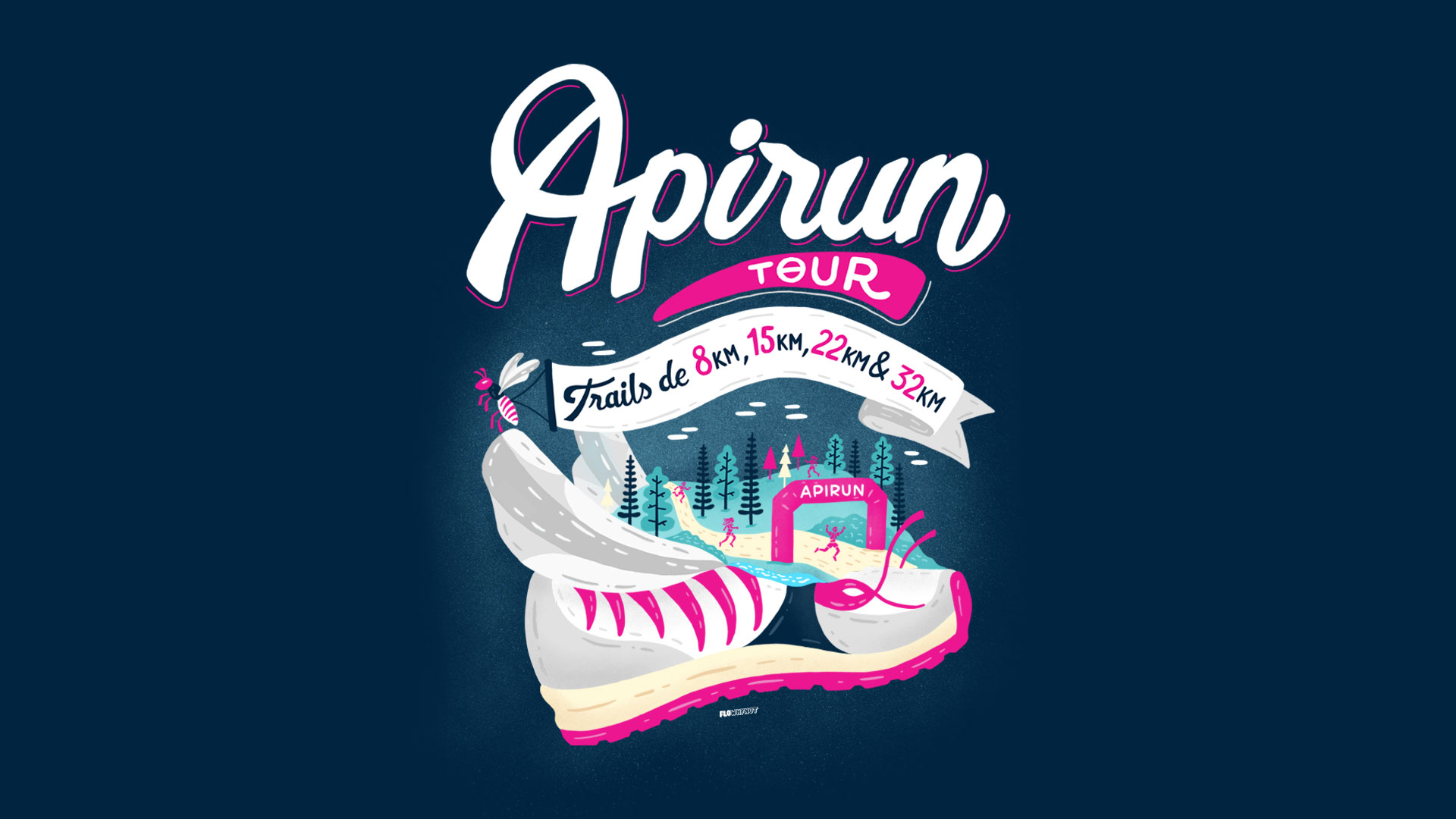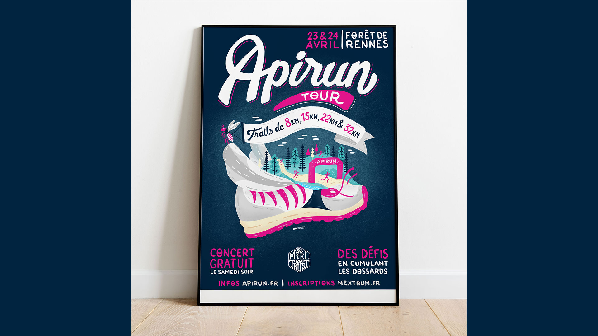 Apirun, la marque bretonne de nutrition sportive à base de miel, a souhaité collaborer avec moi afin de créer l'affiche de son évènement trail : l'ApirunTour. J'ai souhaité représenter l'univers du lieu de l'évènement tout en reprenant les idées du blason, qui mixe une chaussure avec une abeille, réalisé pour le nouveau maillot technique auparavant. Nous avons aussi gardé les nouvelles couleurs afin d'installer un univers de marque.
