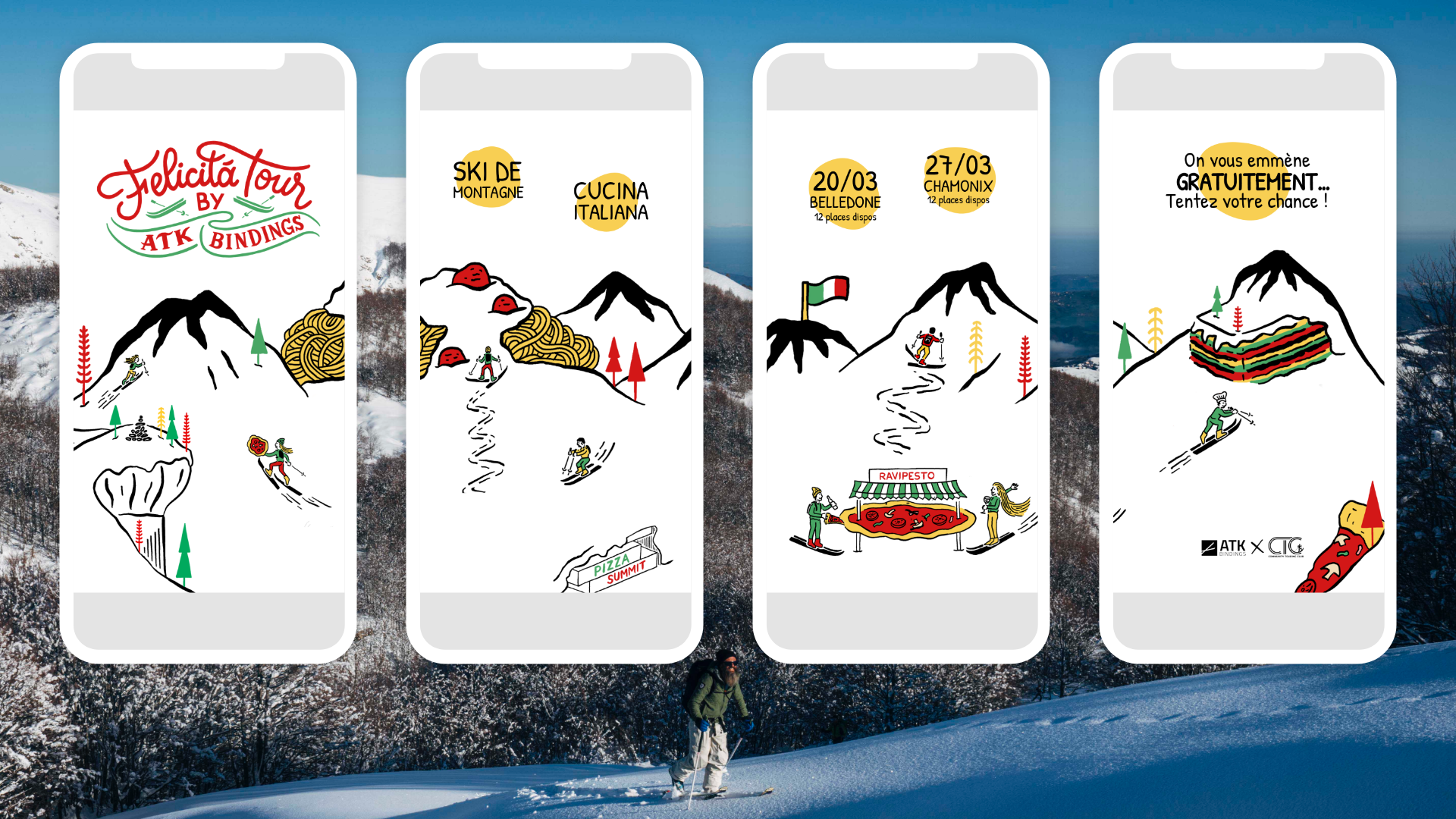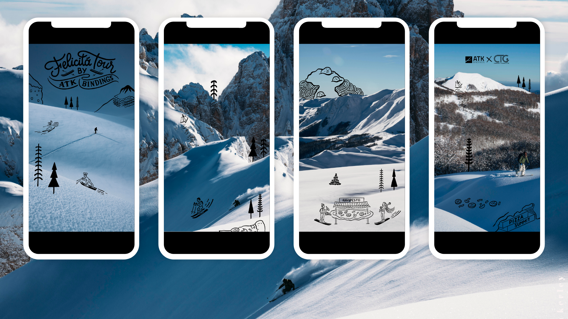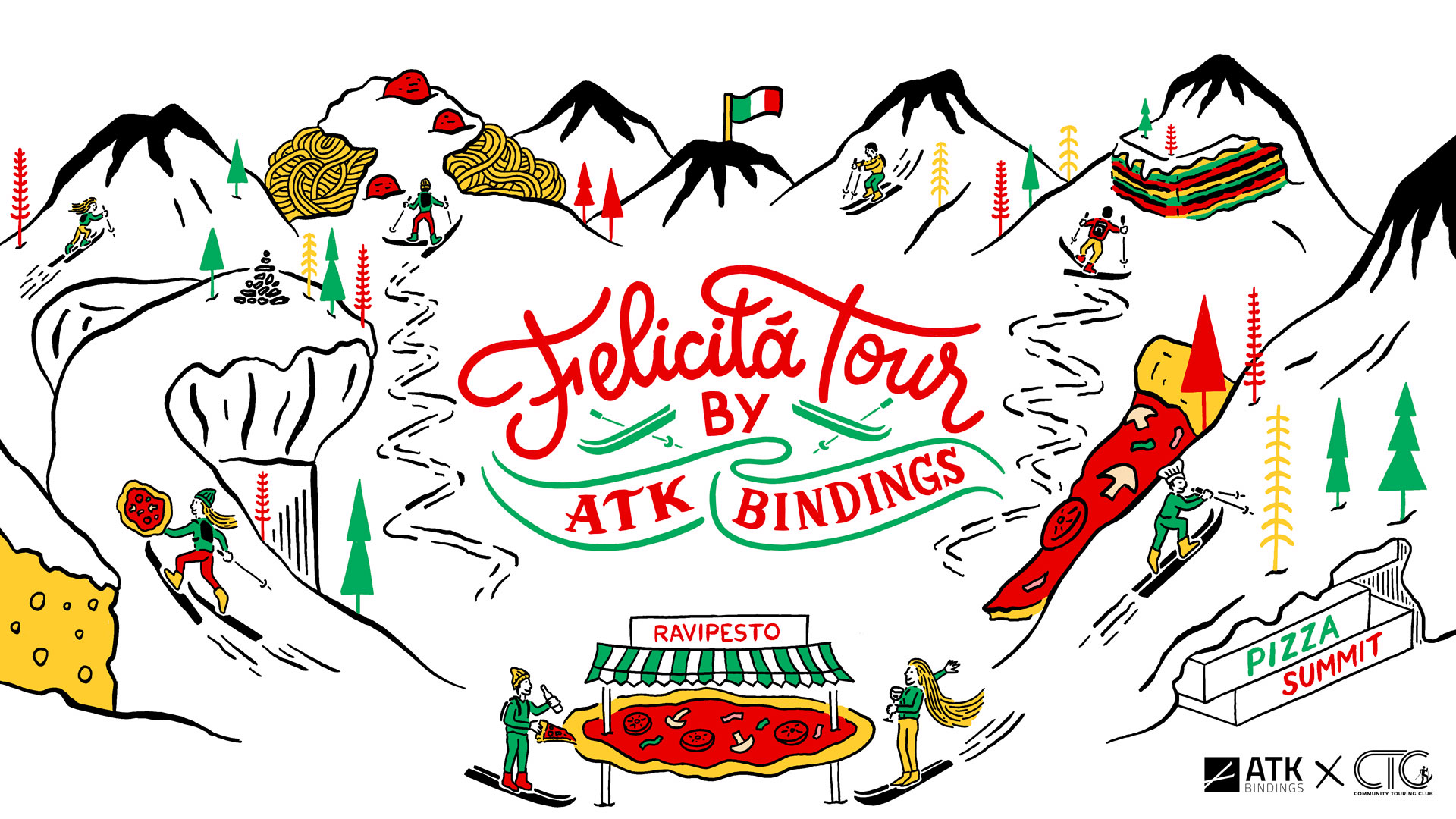 L'agence Outdoor Perspectives m'a fait confiance pour réaliser l'identité visuelle d'un évènement de ski de randonnée entre la marque ATK Bindings et Community Touring Club. L'idée a été de réaliser un univers mêlant le sport en question à la cuisine italienne, pays d'origine de la marque.