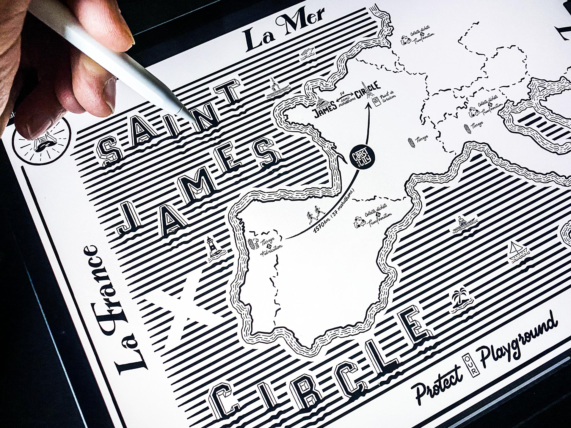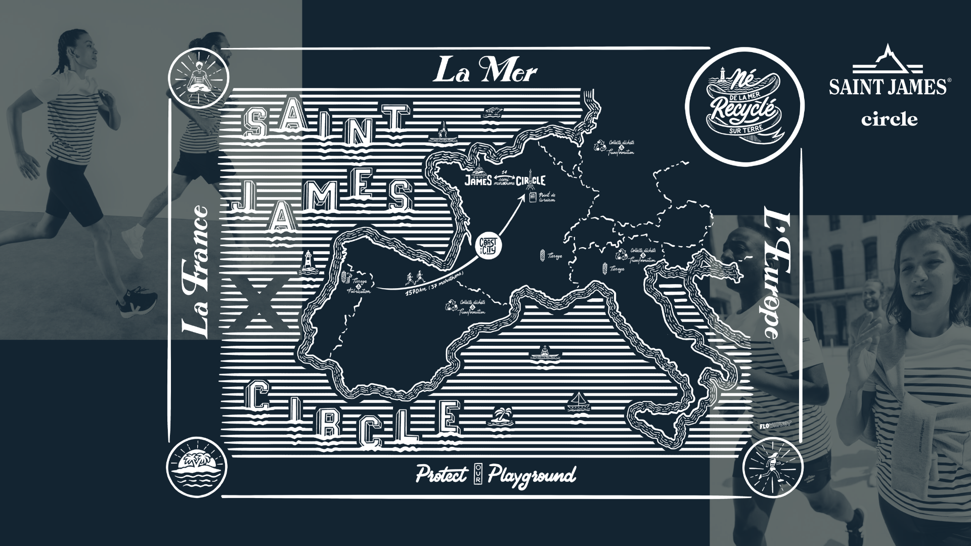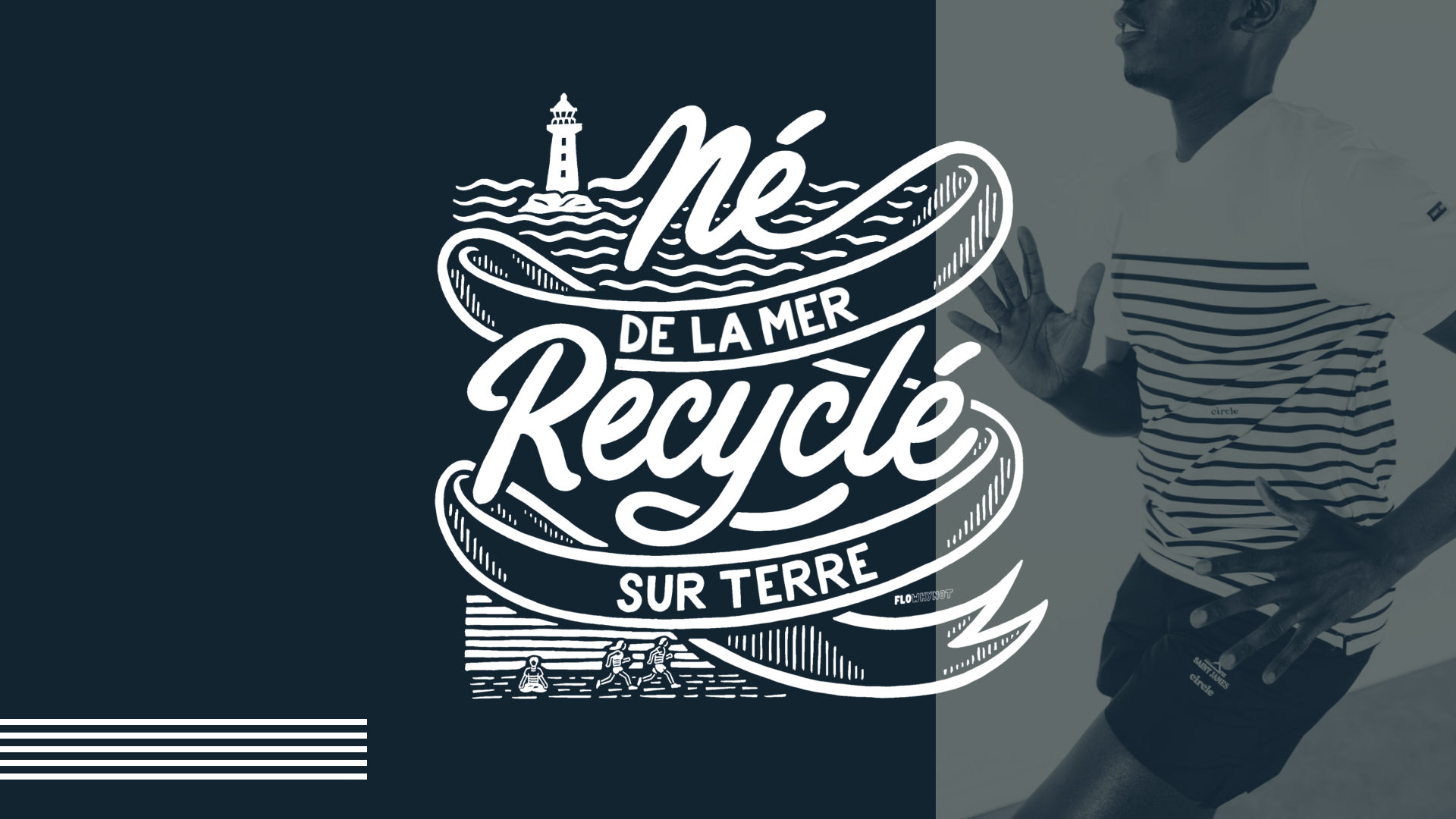 La marque Circle Sportswear m'a demandé de réaliser divers illustrations destinées à habiller des supports venant accompagner sa nouvelle collection exclusive et limitée en collaboration avec la célèbre marque Saint James. L'idée a été de se faire rejoindre les univers urbains et marins avec comme axe principal le recyclage, concept fort de la marque.