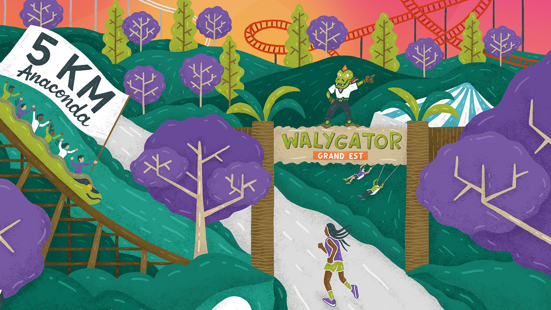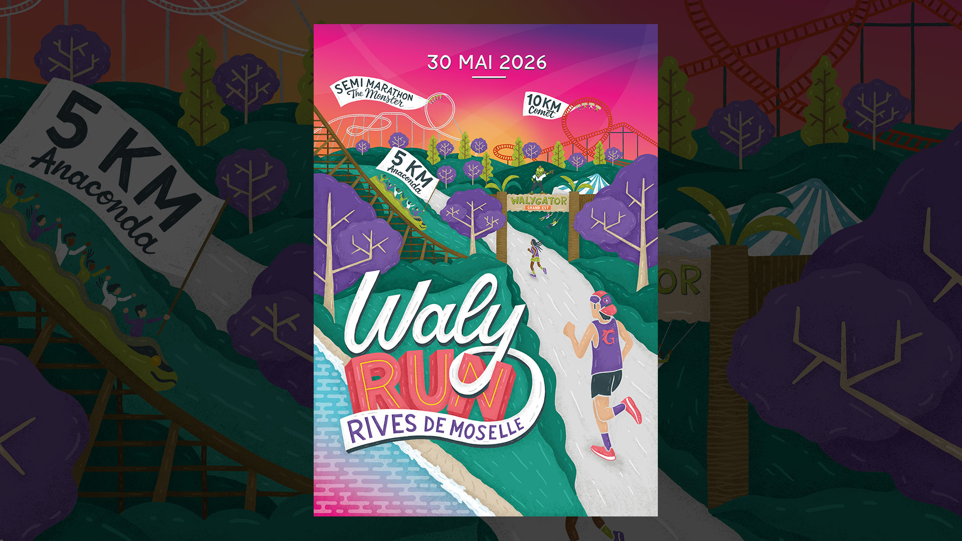 Après m'avoir confié la réalisationde l'affiche de La Légende du Graoully, l'association Graoully Aventure m'a fait confiance afin d'illustrer son nouvel évènement : Walyrun. Une course se déroulant dans le célèbre parc Walygator.